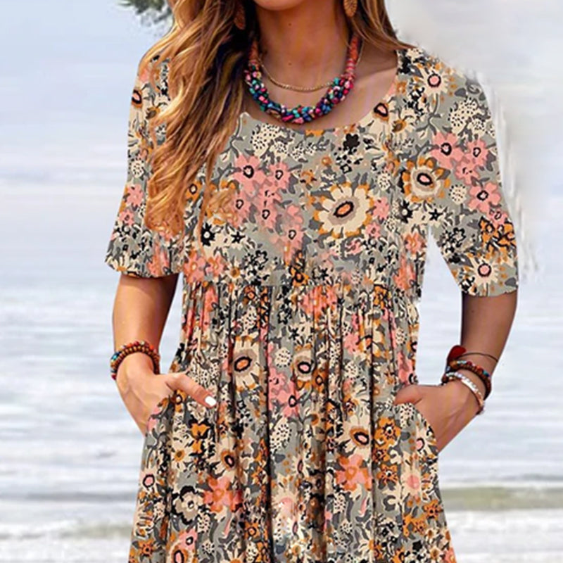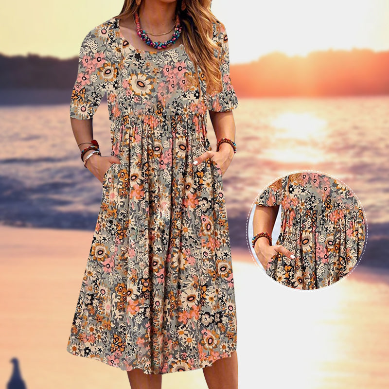 • 1 * Scoop Neck Floral Printed Pockets Midi Dress