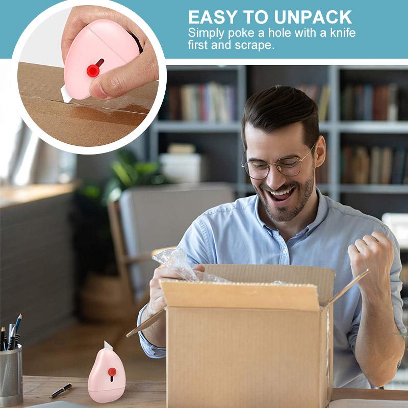 This stamp is built with sharp knife, convenient for opening and cutting boxes, letter, mails, etc. Simply press button on side to use.