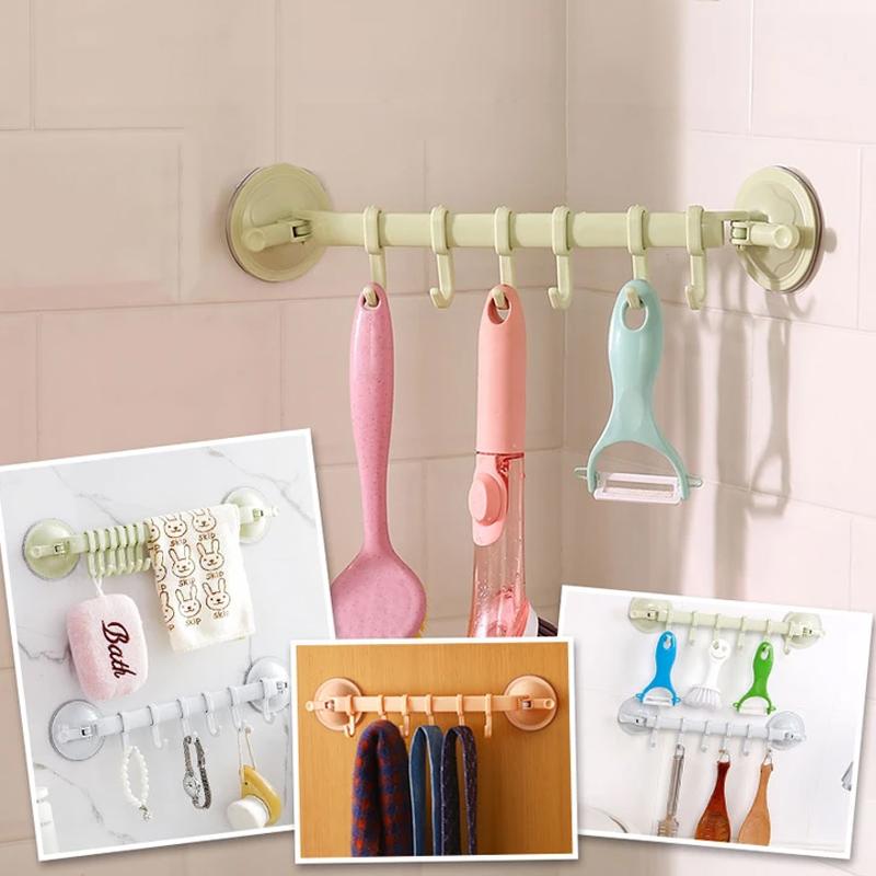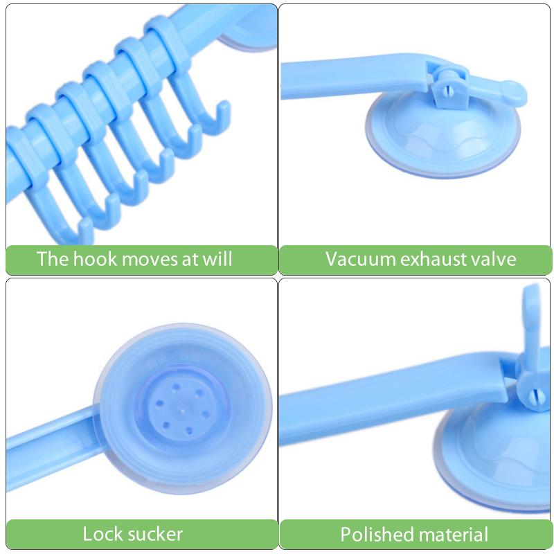 Cup and lock design, strong adsorption force, good load-bearing, 6 hooks can be installed on the wall, can be moved around. Vacuum double suction cup, strong suction can withstand about 3-5 kg.