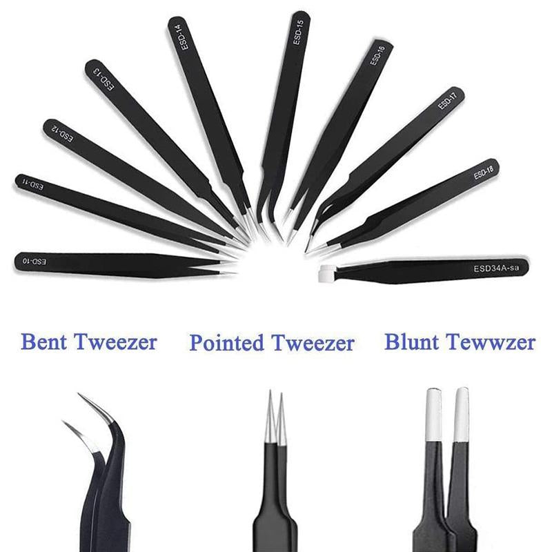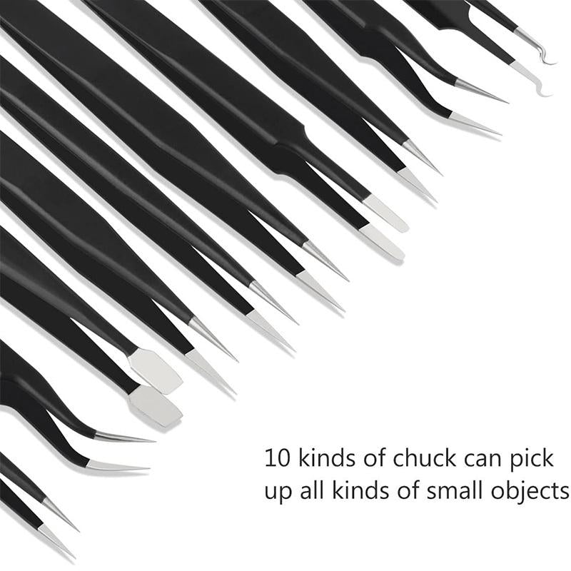 A 10 pack stainless steel tweezer set is antic-static and non-magnetic tweezers designed for multiple-precision jobs for both women and men. Excellent tool bag, easy to take out and store with no hassle.