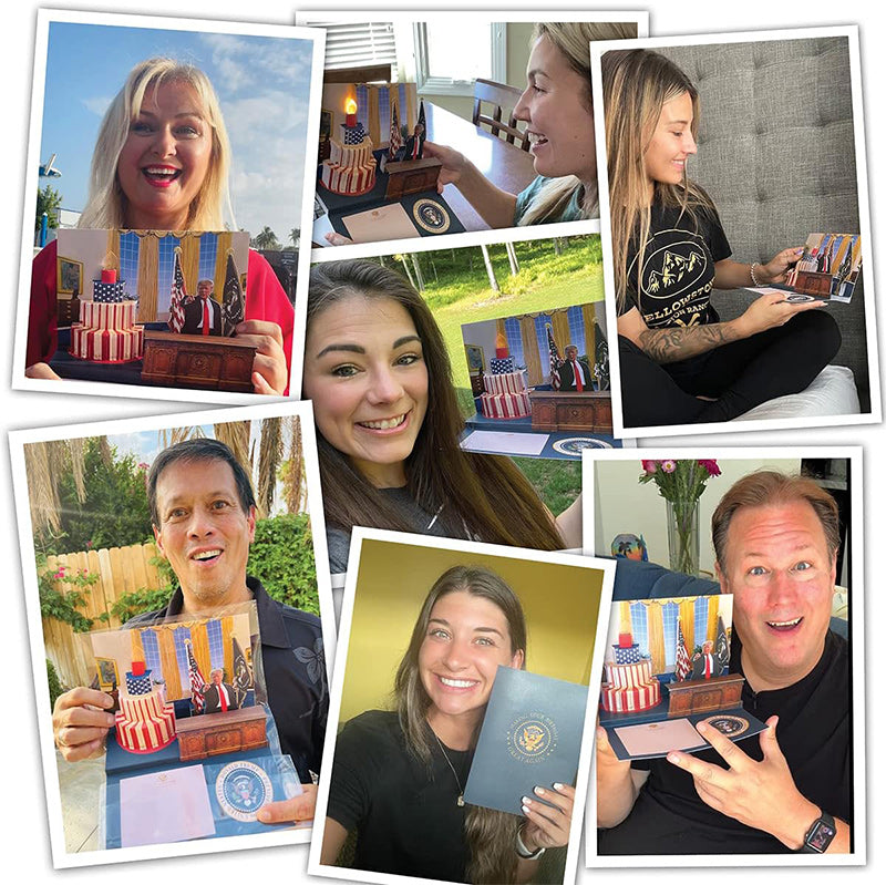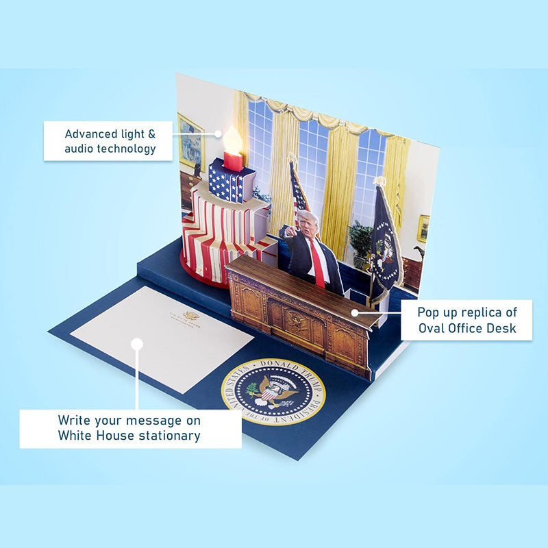 Make someone's birthday great again! When your friend or loved one opens up this awe-inspiring birthday card, our 45th President delivers a personal message to them with patriotic background music. This is the greatest birthday card you can give somebody with or without a trump teddy bear or Biden toilet paper.