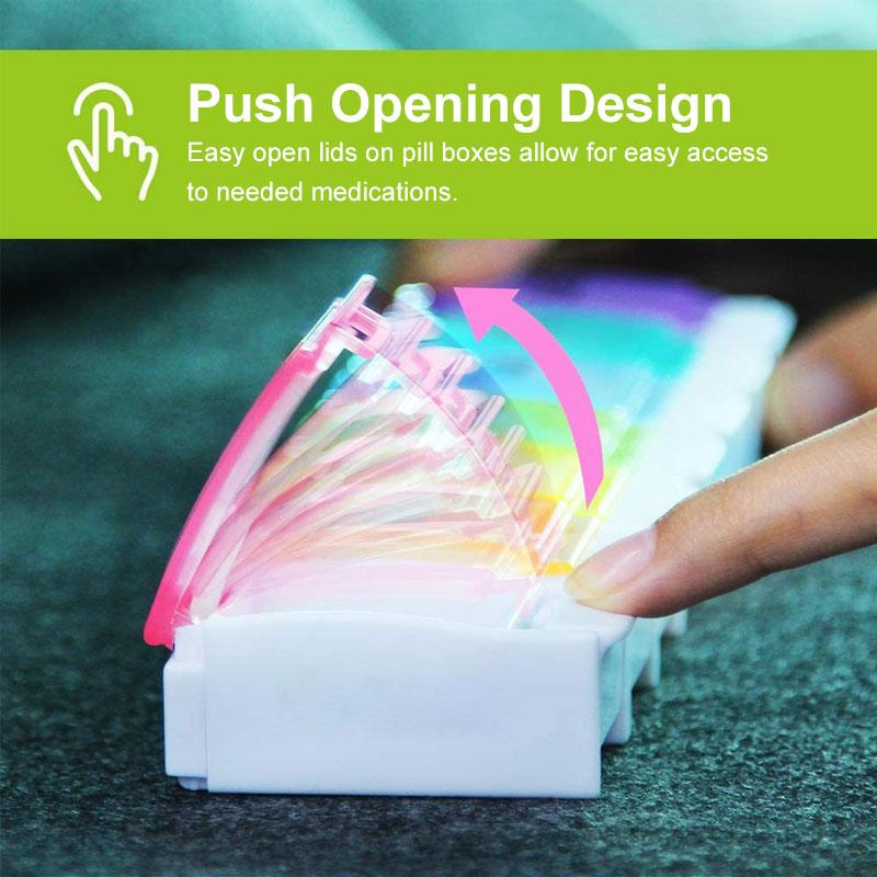 • SPRING ASSISTED OPEN DESIGN. We use the latest design on this weekly pill organizer to achieve one-handed operation with the little rubber strips for the smart "lid spring open" feature. The lids are all beautifully colored and marked clearly with the date, everything is clear at a glance so you may find it easy to choose the pills you need. It's quite nice for easy daily dispensing and big enough to hold 8 fish oils or 12 large vitamins for each dose (size of each compartment: 1.3"x1.18"x0.82")