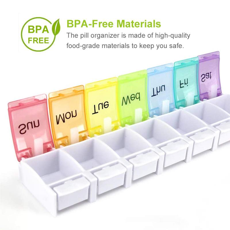 • BPA-FREE MATERIALS. This pill case is pretty safe because of being made of food grade materials. You would be worry-free with the BPA-free pill boxes and organizer when storing multiple pill regimes inside. With the transparent plastic lid, it's quite easy to distinguish the pills in each dose without opening the lids.
