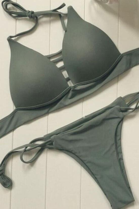Sexy two piece bikini swimsuit featuring a v-neck bikini top with strappy front, a self-tie halter neck, a pair of low rise bikini bottom with self-tie sides, allover solid color.