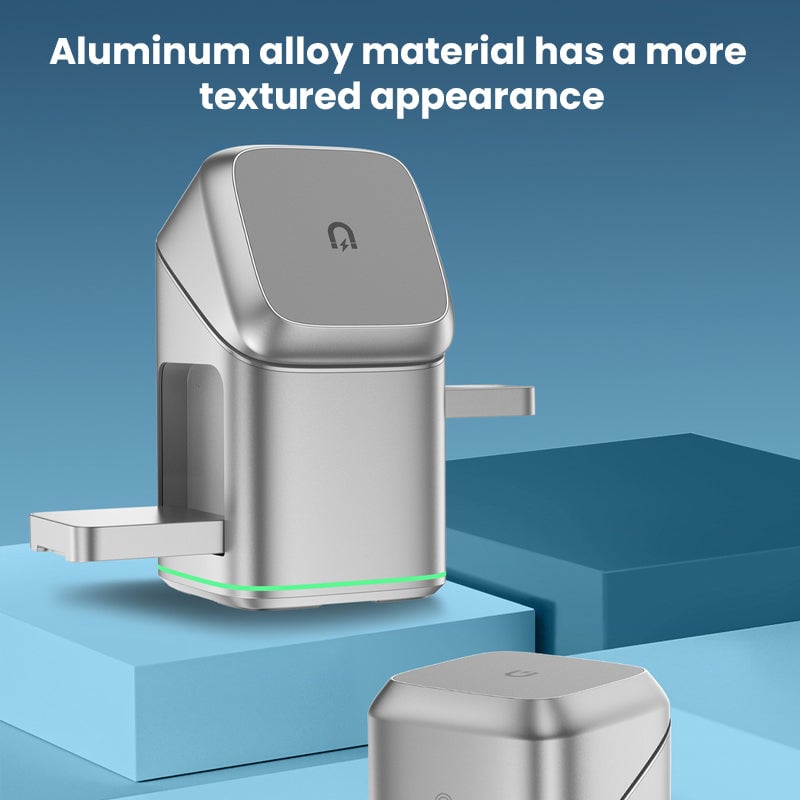 Our 3-in-1 Wireless Fast Charging Charger features magnetic wireless fast charging, an electric rotating hidden charging pod, and the ability to charge three devices simultaneously. Its minimalistic metal design keeps your desktop clean and organized while offering fast and efficient charging.