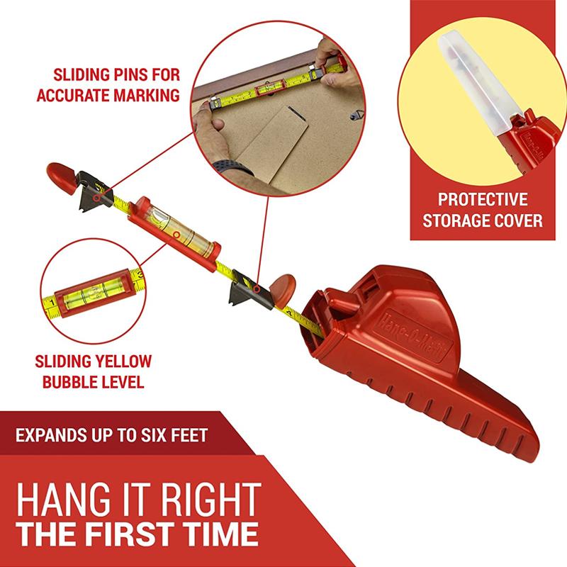 QUALITY CONSTRUCTION. The Hang-O-Matic Tape Measure includes a sliding yellow bubble level and contains sliding pins, guiding the user to accurately mark the wall in a desired position for hanging horizontally or vertically.