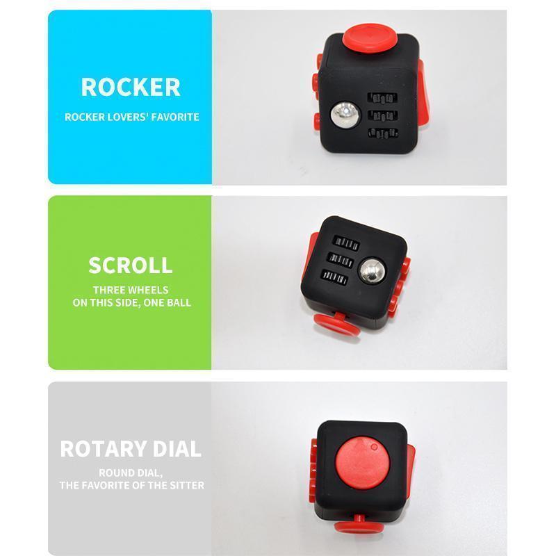 Stress Relief Cube has six sides. Each side features something to fidget with: Click. Glide. Flip. Breathe. Roll. Spin.