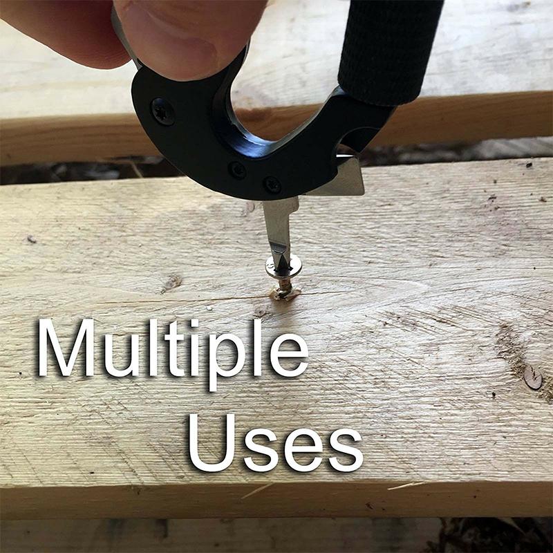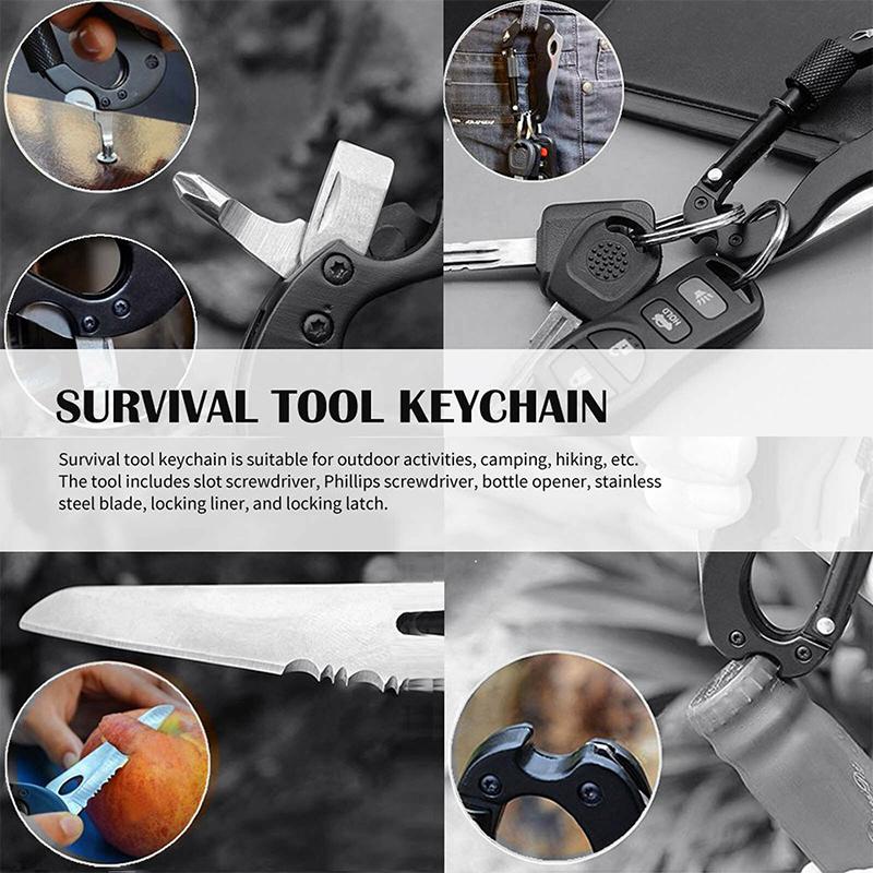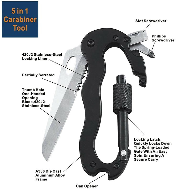 This multi-purpose tool can be used as a knife, and a hanging carabiner, a screwdriver, a slotted screwdriver, a bottle opener and a edc keychain.